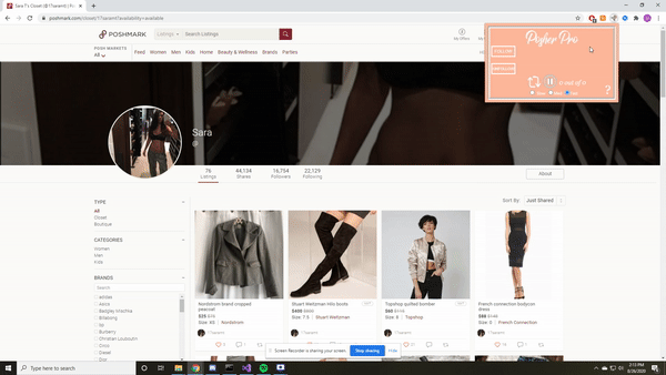 We all know growing your closet is important and we can help. Go to your closet and click on Followers / Following. Next, click the Follow button on Posher Pro to automatically follow hundreds of new users instantly!